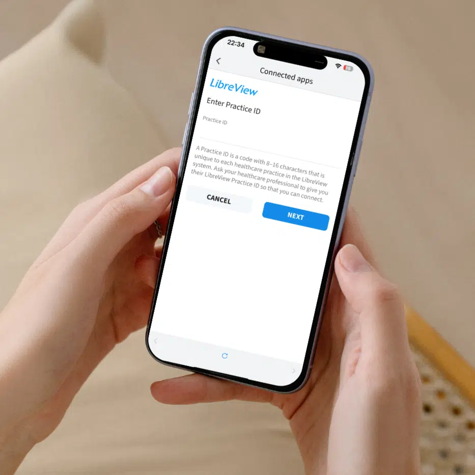 Klik bij Libreview op “Verbinden” en op “Aansluiten bij een praktijk”.